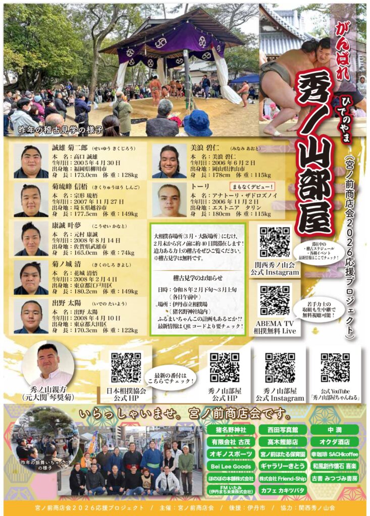 昨年末から、「がんばれ秀ノ山部屋」フライヤー(宮ノ前商店会2026応援プロジェクト)が宮ノ前通りの街灯のフライヤーボックスや宮ノ前商店会加盟各店舗、市内の各施設にて無料配布されています。
